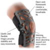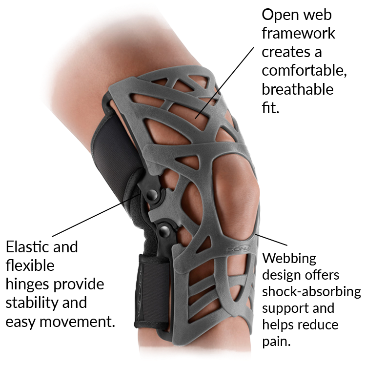 Lightweight, open-web knee brace with shock-absorbing web technology for relief of mild to moderate osteoarthritis and anterior knee pain.